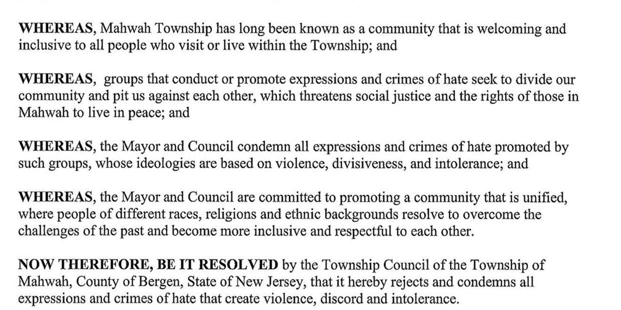 After the Coalition followed up again August 10th looking for the resolution on the agenda, the council meeting agenda was amended on August 11th, 2022, and the one year Resolution: Condemning Expressions and Crimes of Hate That Divide and Threaten Our Members of Our Community was presented and approved by the Mahwah Township Council unanimously without discussion.